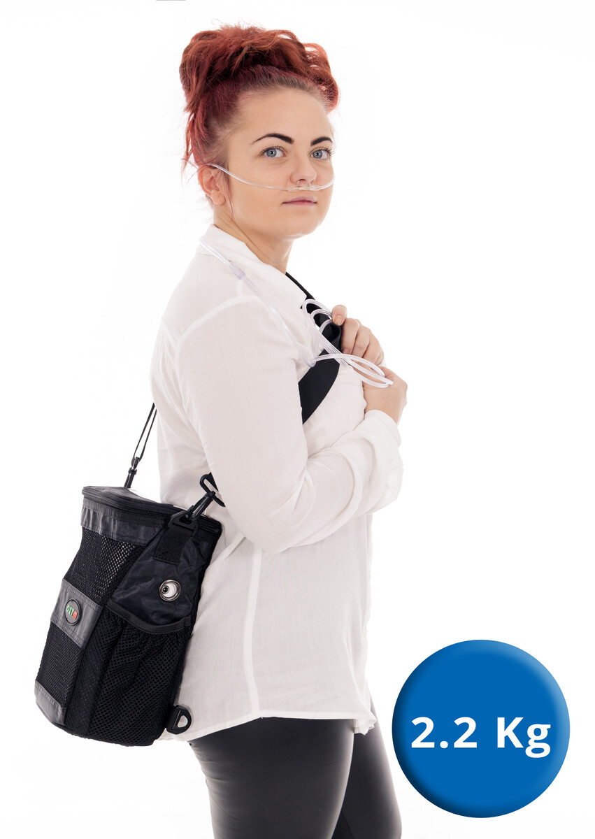 Malý a ľahký prenosný kyslíkový koncentrátor s hmotnosťou len 2,2 kg ponúka periodické dávkovanie kyslíka v impulzoch synchronizovaných s dýchaním používateľa prístroja.