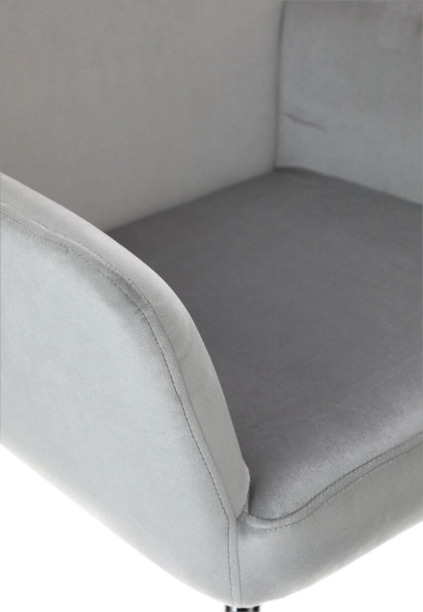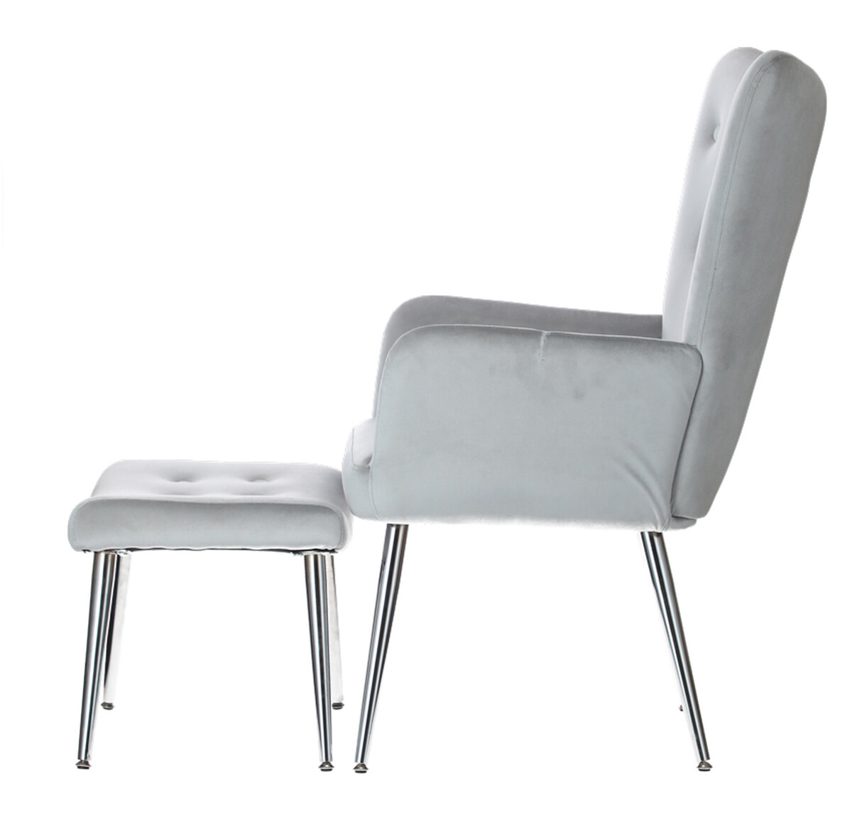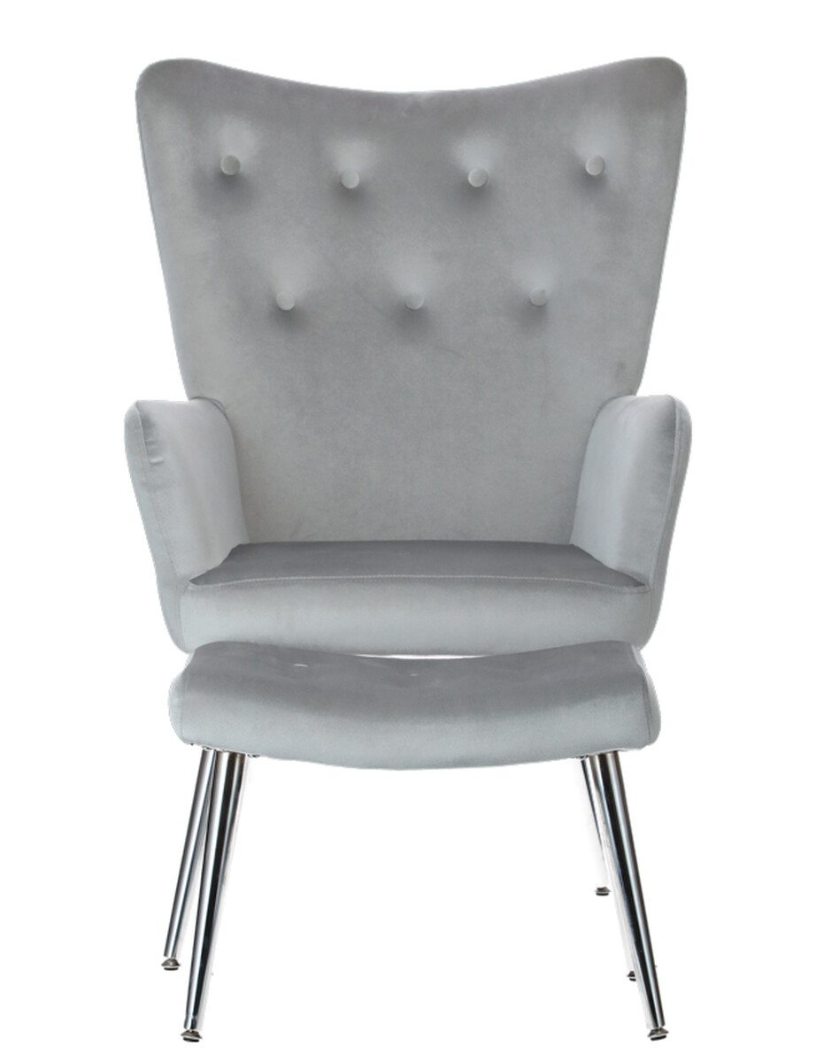 Doplňte svoj interiér atraktívnym relaxačným kreslom s podnožkou, ktoré bolo dizajnované do moderného elegantného štýlu. Spracovanie z hebkého zamatového poťahu v svetlosivej farbe s jemným leskom je dokombinované štíhlymi striebornými nožičkami, ktoré odľahčujú celkový vzhľad kresla.