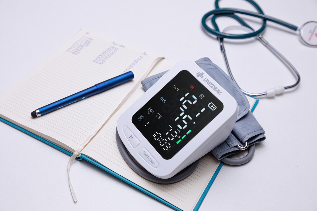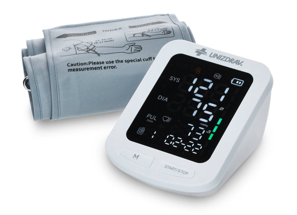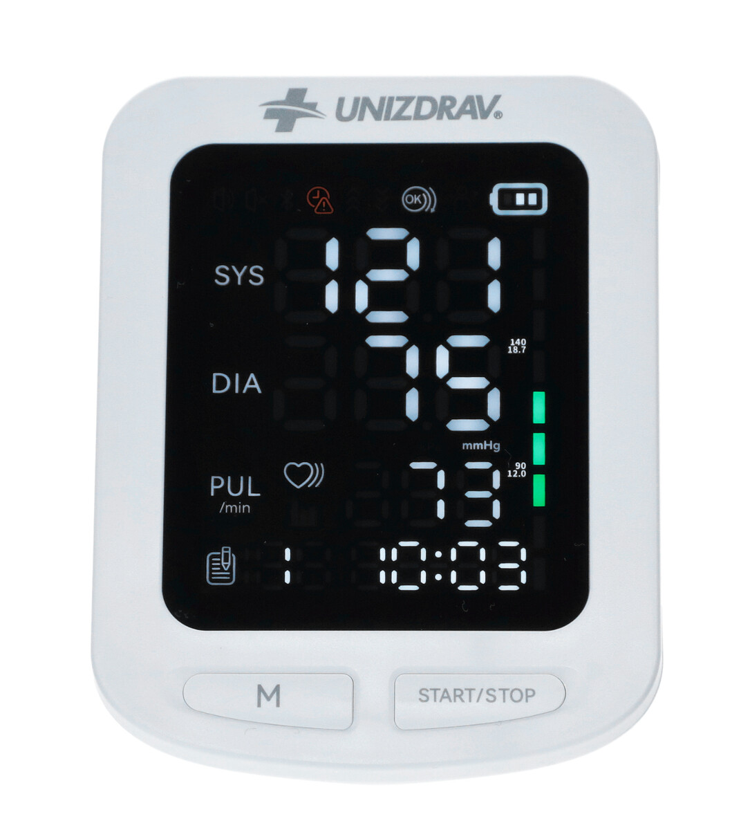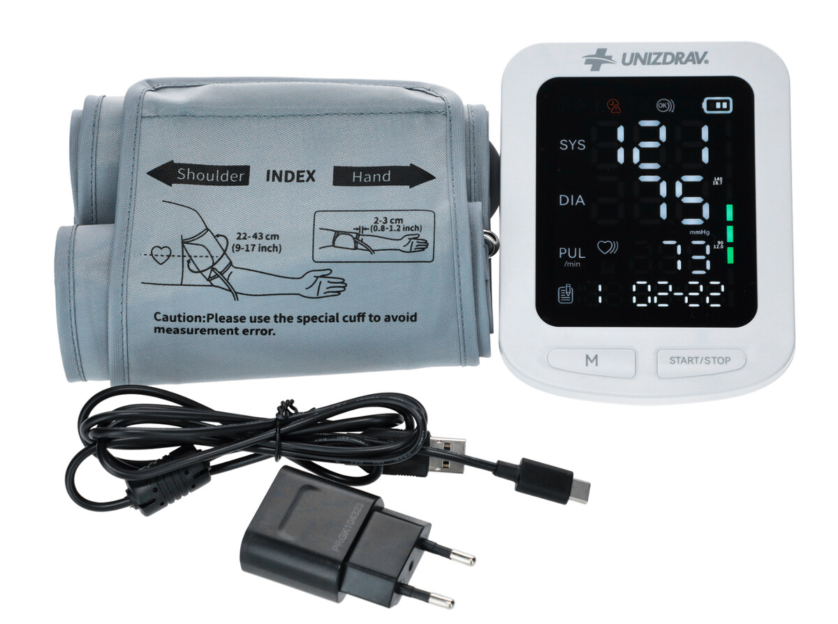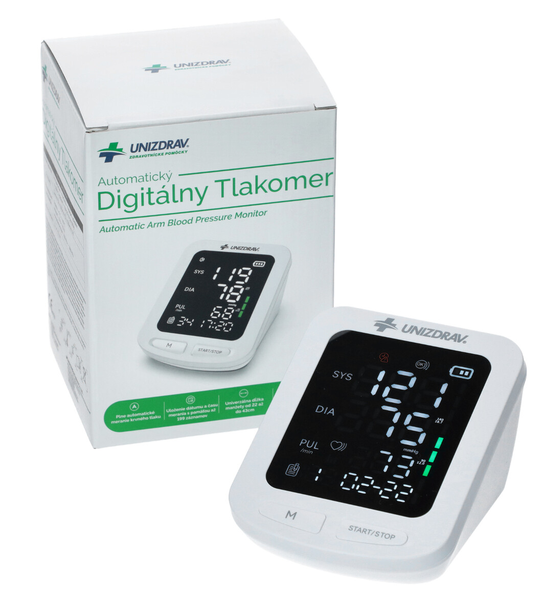 Digitálny tlakomer UNIZDRAV meria ľudský systolický a diastolický krvný tlak, ako aj tepovú frekvenciu priamo na ramennej tepne.