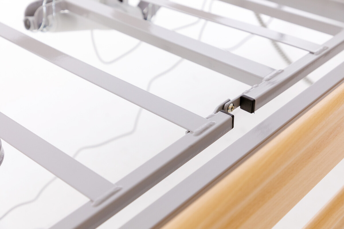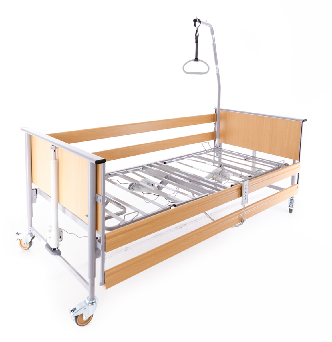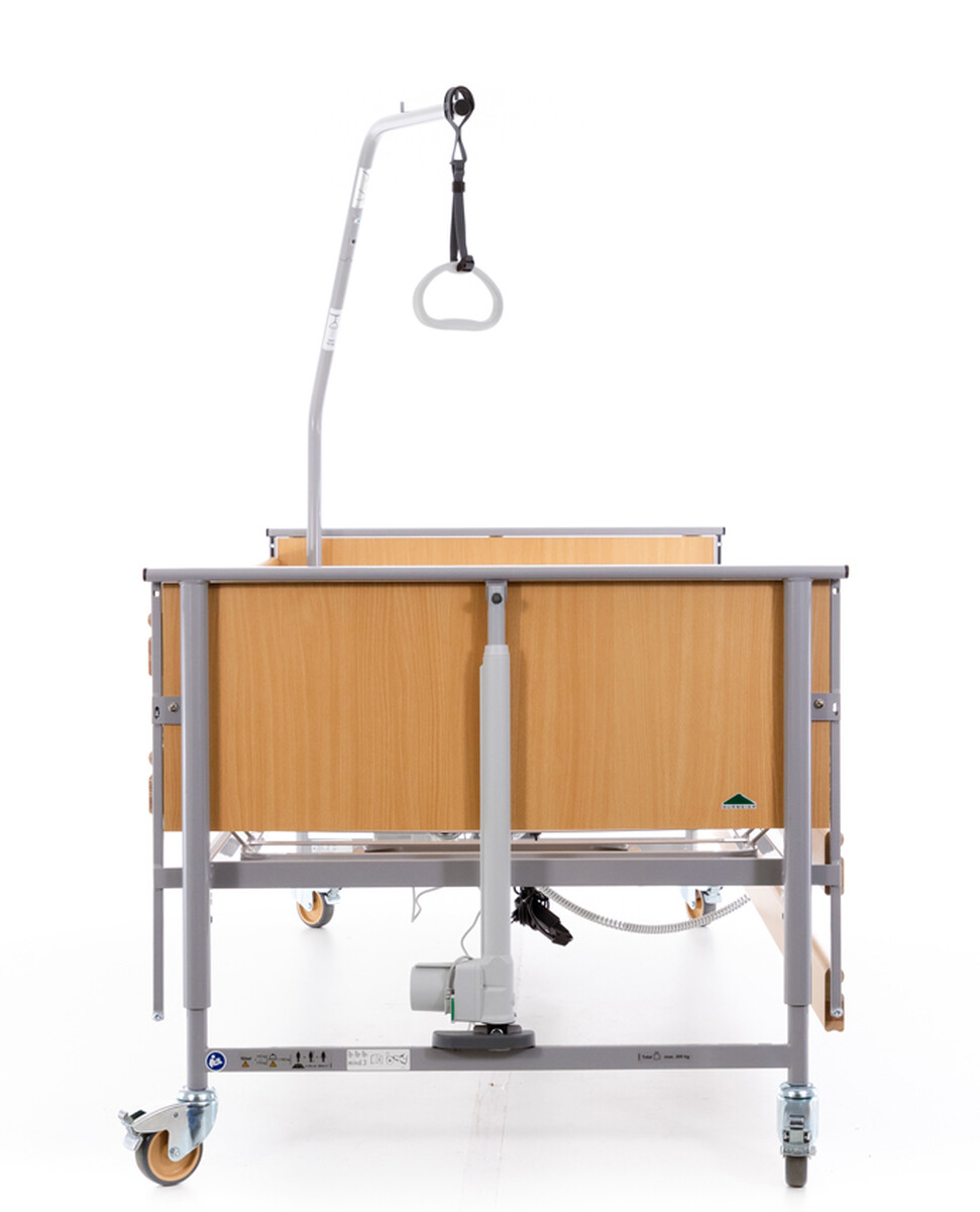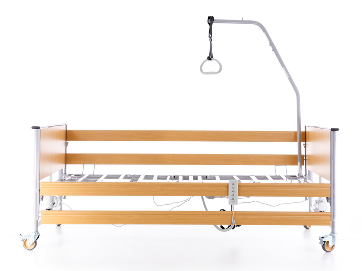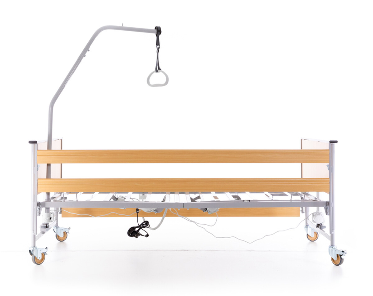 Vo výbave zdravotnej postele s polohovaním nechýba ani závesná hrazda, ktorá pacientovi umožňuje ľahšie meniť polohu a odľahčovať tak zaťažované časti tela. Sklopné drevené bočné zábrany zvyšujú bezpečnosť pred pádom.