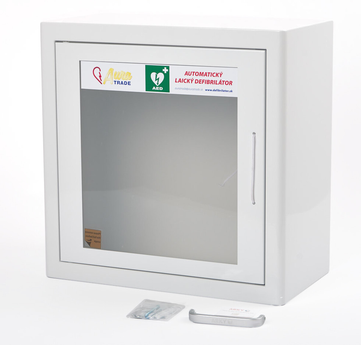 Vnútorná skrinka na bezpečné uloženie a prezentáciu AED defibrilátora vrátane alarmu.