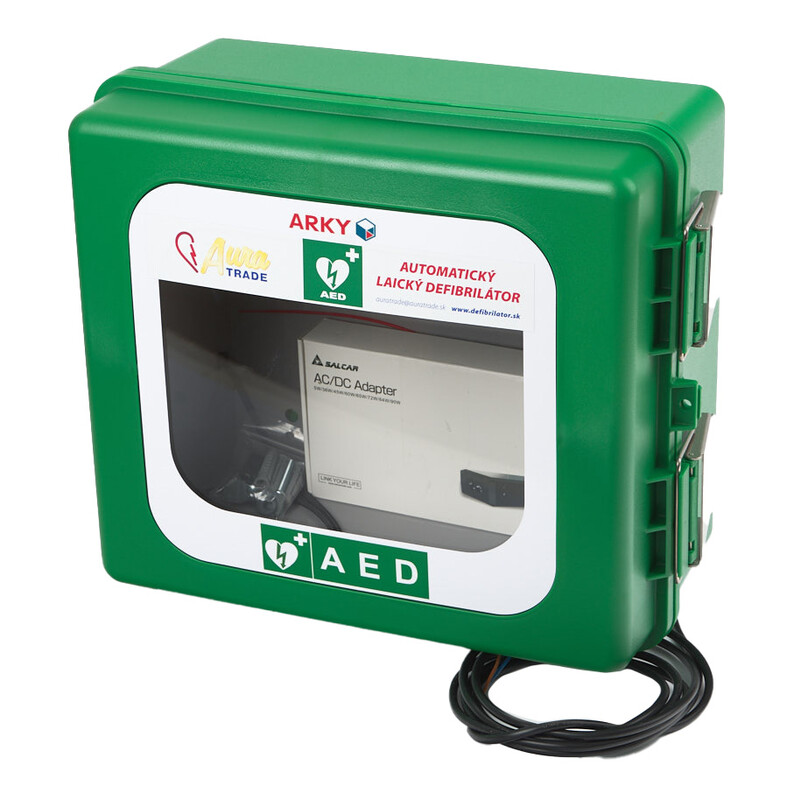 AED skrinka má plastovo-kovový obal potiahnutý odolnou práškovou farbou a priehľadné sklo. Rozmery 38 x 38 x 20 cm ponúkajú dostatočne veľký priestor na bezpečné uloženie defibrilátora.