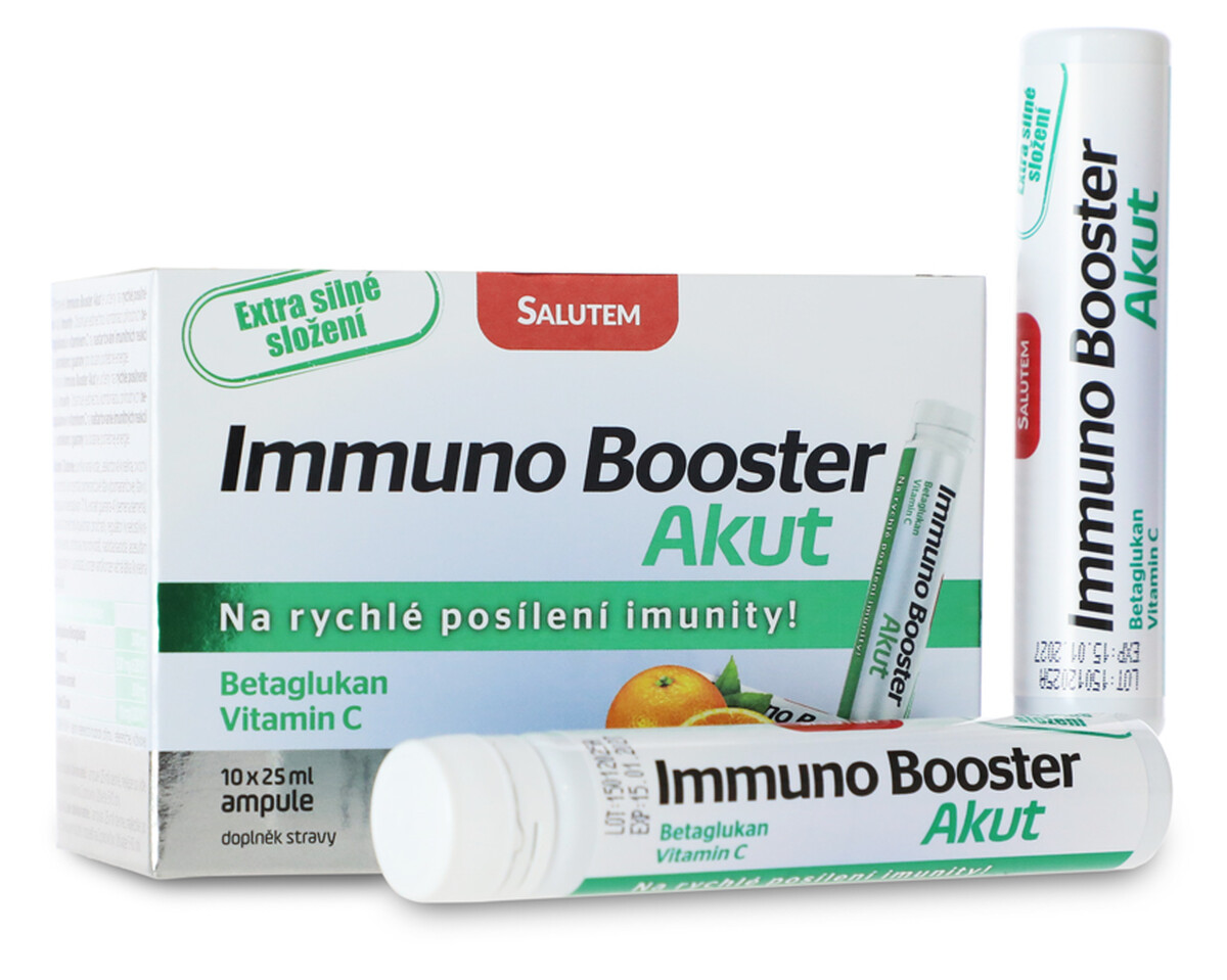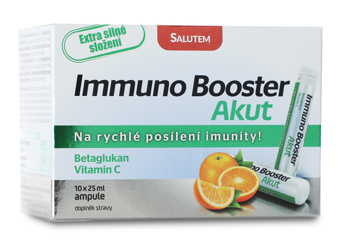 Výživový doplnok Immuno Booster Akut od značky SALUTEM je určený na rýchle posilnenie imunitného systému. Obsahuje jedinečnú kombináciu prírodných betaglukánov, vitamínu C a guarany, ktoré pomáhajú naštartovať imunitné reakcie organizmu.