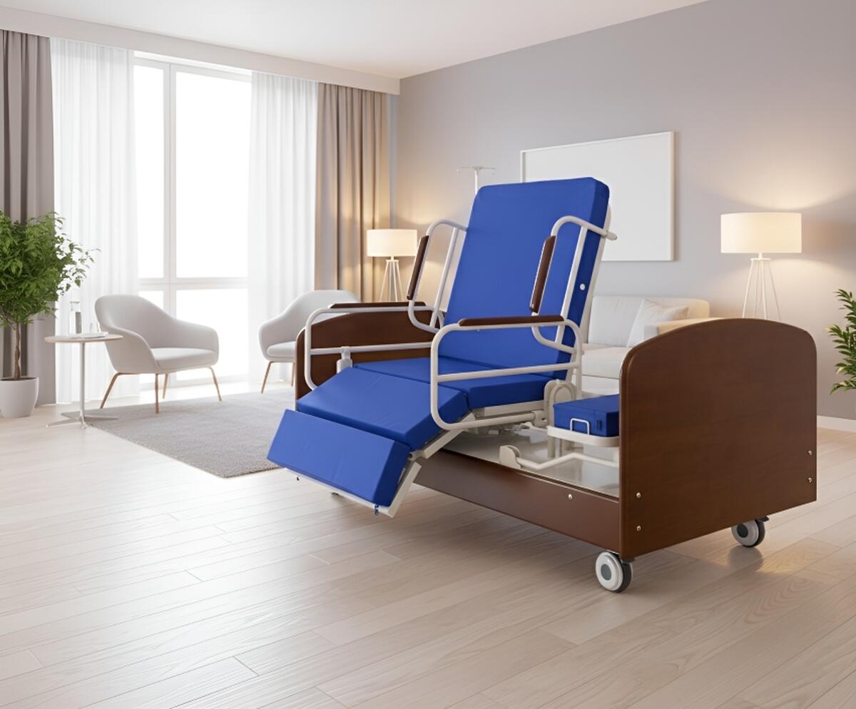 Zdravotná polohovateľná posteľ s jedinečnou funkciou otáčania a zdvíhania do polohy sedu podporuje mobilitu pacientov a zjednodušuje každodennú opateru.