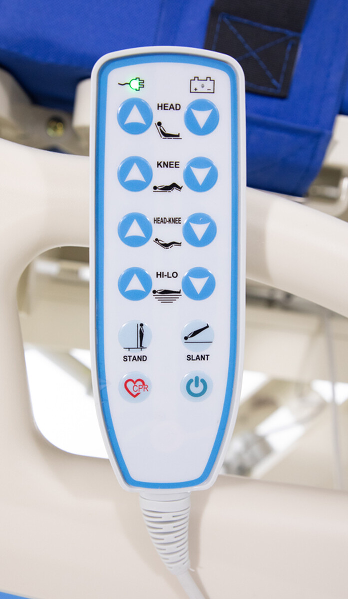 Na rehabilitačnej posteli Vertica sú k dispozícii viaceré funkcie, ktoré je možné nastaviť pomocou diaľkového ovládača. Ten je vybavený praktickým háčikom na zavesenie, takže zostáva vždy poruke. Praktickým doplnkom je tiež stupnica s ukazovateľom nastaveného uhla sklonu.