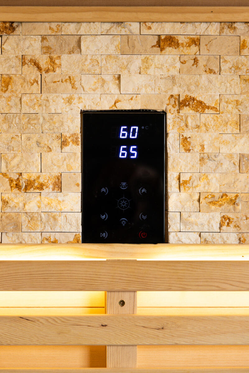 Ovládanie sauny je riešené pomocou Wi-Fi ovládacieho panela, ktorý umožňuje jednoduché a presné nastavenie teploty a prevádzky. Komfort počas saunovania zvyšujú integrované reproduktory s podporou Bluetooth a USB, vďaka ktorým si môžete vychutnať relaxačnú hudbu. Príjemnú atmosféru dotvára jemné farebné LED osvetlenie.