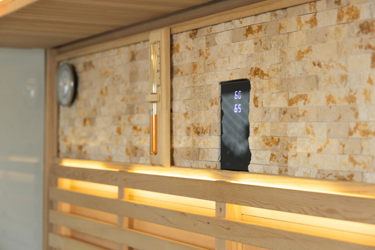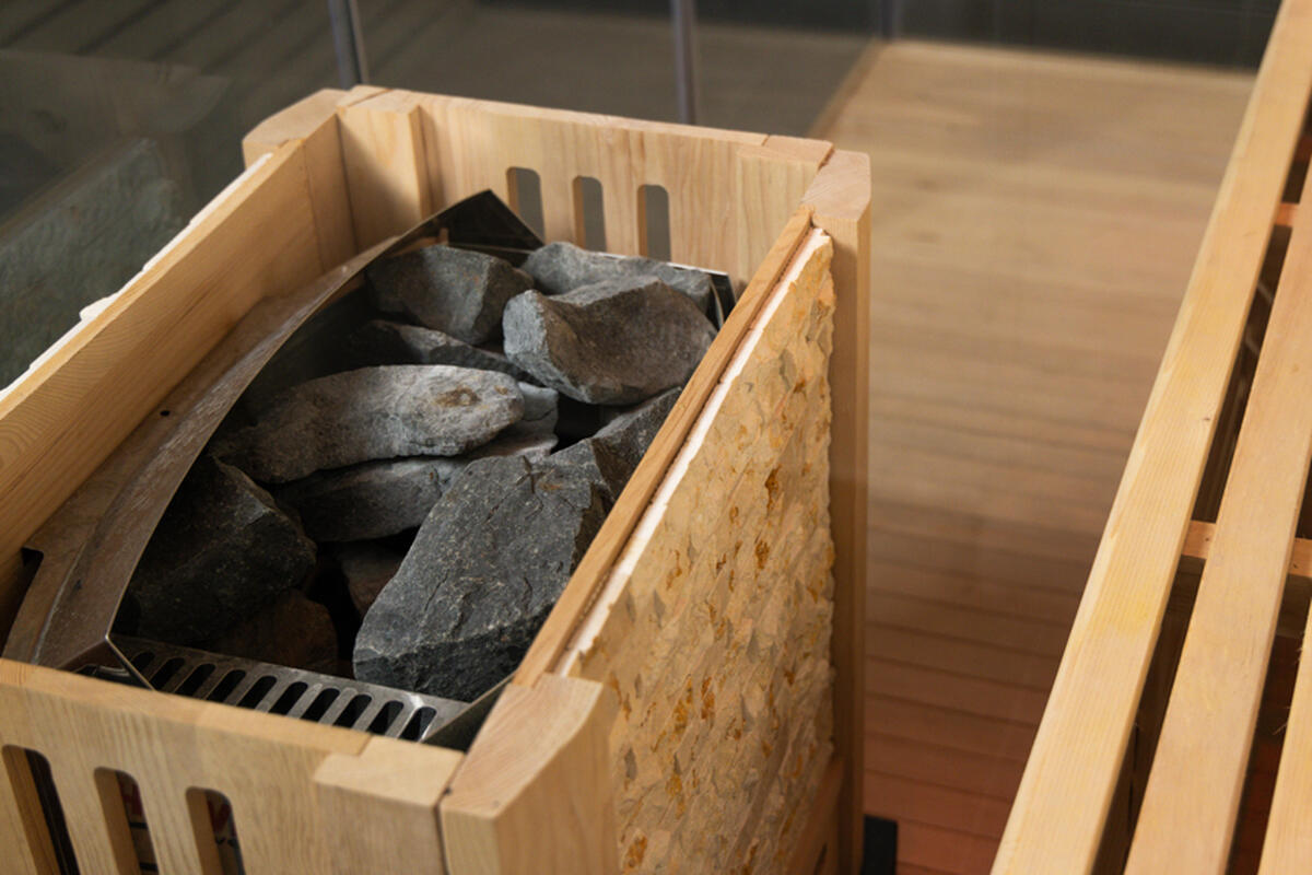 Interiér dopĺňa dekoratívny kamenný obklad na zadnej stene, ktorý zvyšuje akumuláciu tepla a zároveň podčiarkuje prémiový charakter sauny. Kombinácia prírodného dreva, kameňa a skla vytvára harmonický, nadčasový vzhľad.