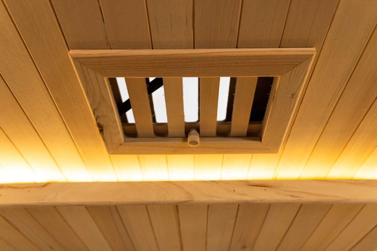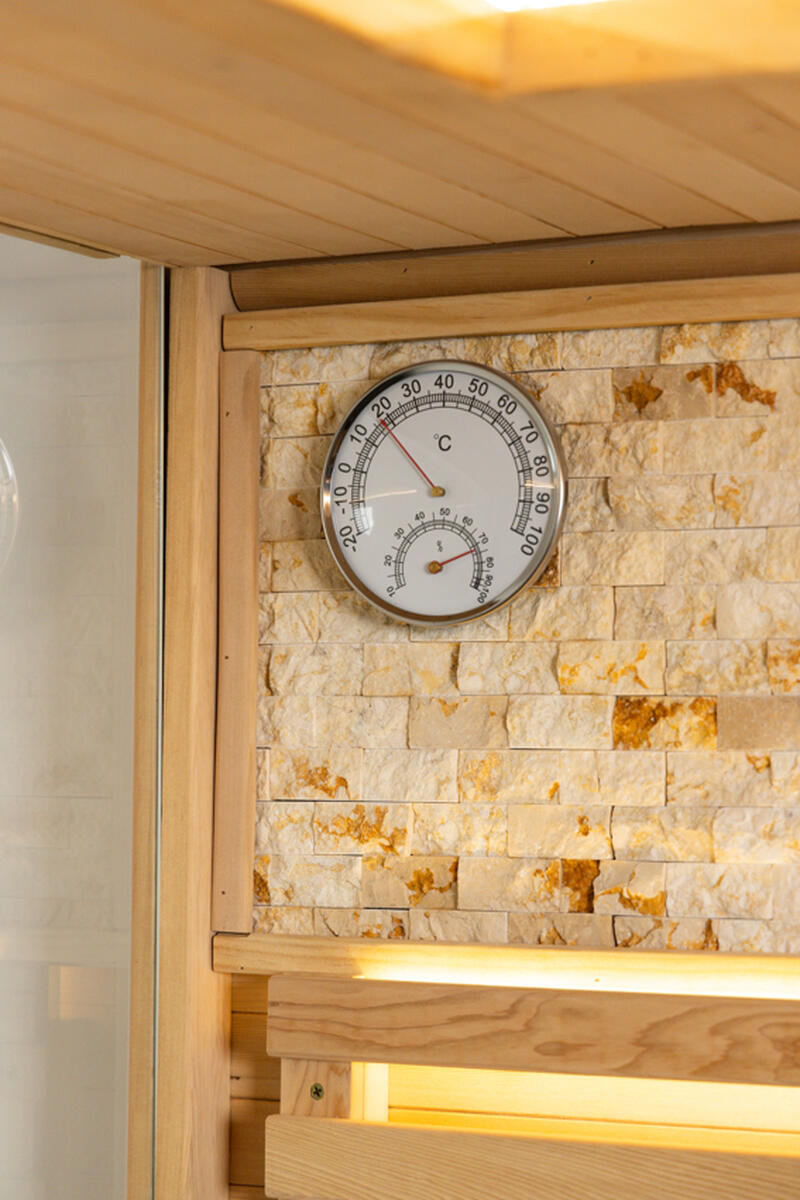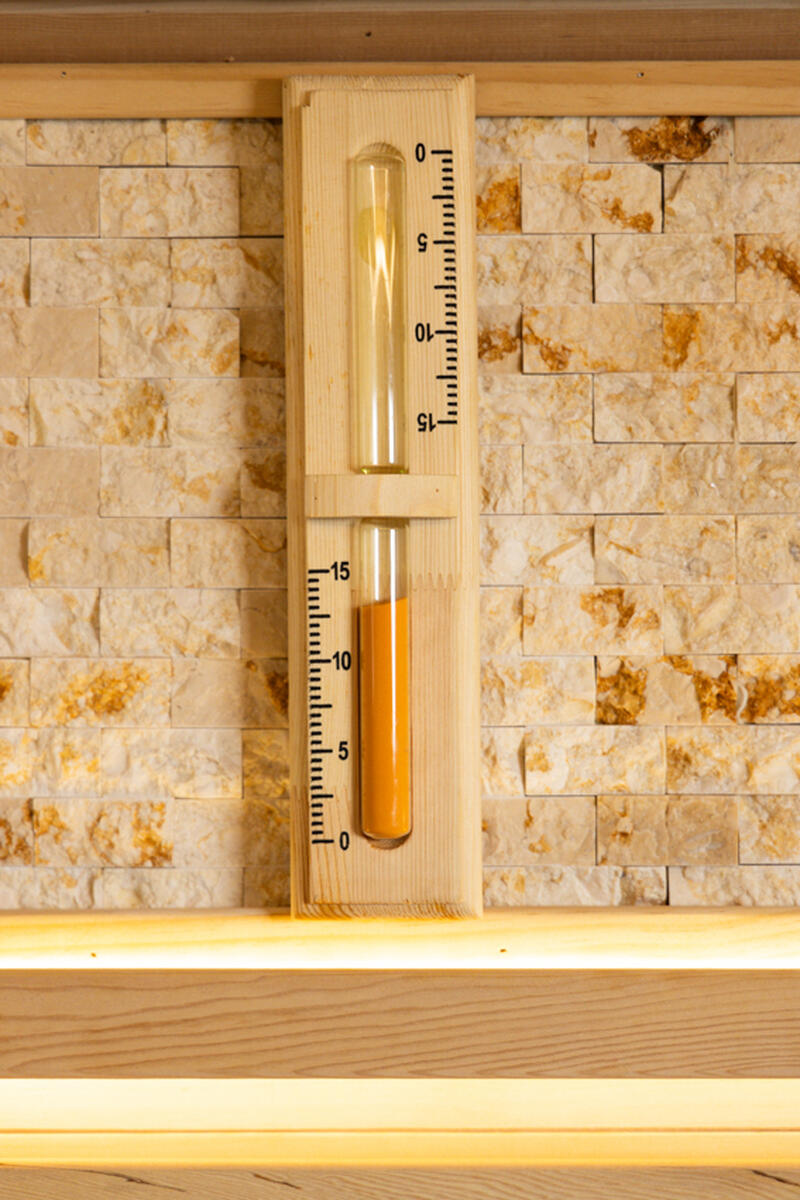 Sauna je vybavená všetkými dôležitými prvkami pre bezpečné a pohodlné používanie – kombinovaný teplomer a vlhkomer, presýpacie hodiny, drevené vedro s naberačkou a osvetlenie odolné voči vysokým teplotám. Dvojitá strecha zlepšuje tepelnú izoláciu, znižuje tepelné straty a prispieva k energeticky efektívnej prevádzke.