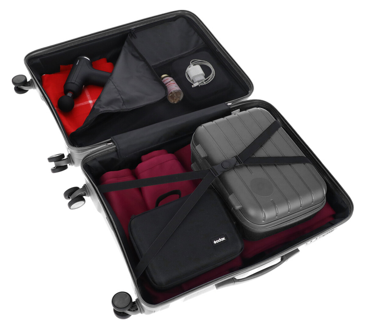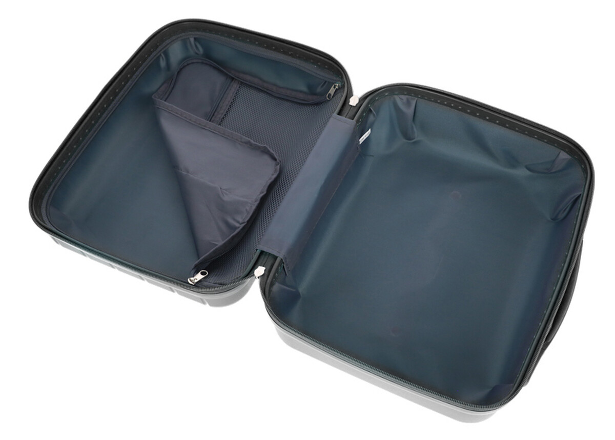 Interiér cestovného kufra je fuknčne rozdelený na dve časti. Jedna strana je vybavená elastickými krížovými popruhmi a druhá strana celoplošným uzatvárateľným vreckom na zips a samostatným sieťovaným vreckom na drobnosti.