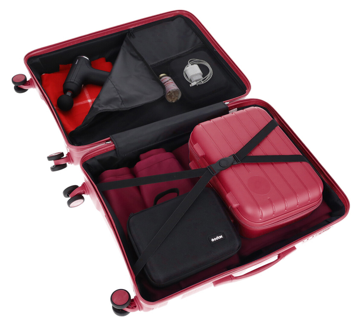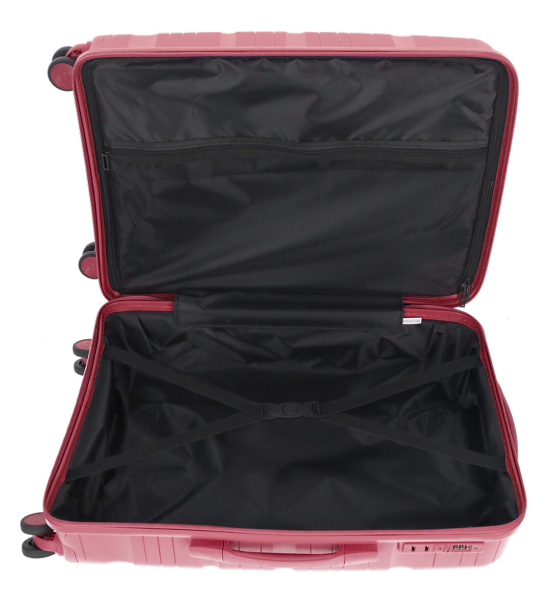 Interiér cestovného kufra je fuknčne rozdelený na dve časti. Jedna strana je vybavená elastickými krížovými popruhmi a druhá strana celoplošným uzatvárateľným vreckom na zips a samostatným sieťovaným vreckom na drobnosti.