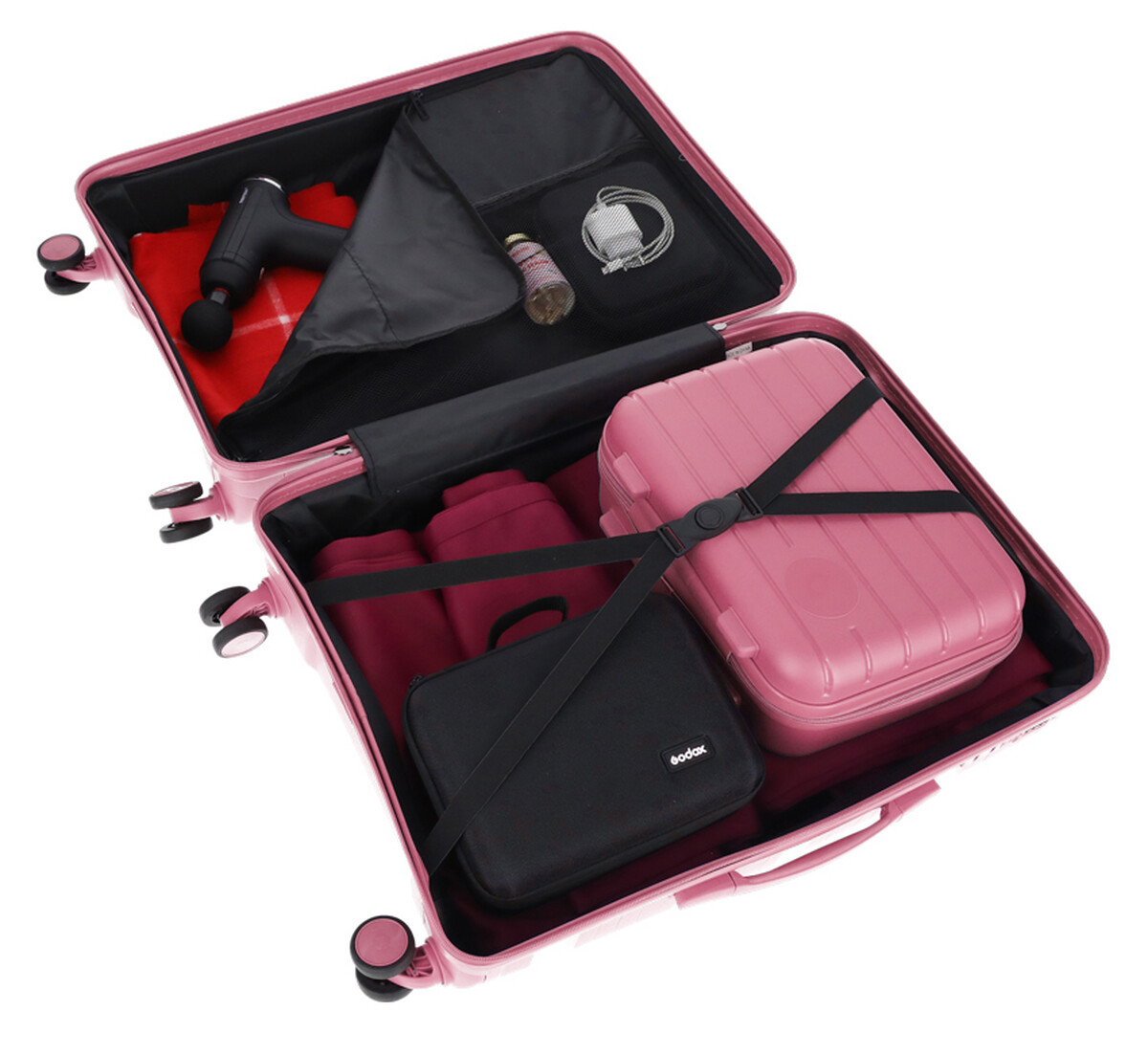 Interiér cestovného kufra je fuknčne rozdelený na dve časti. Jedna strana je vybavená elastickými krížovými popruhmi a druhá strana celoplošným uzatvárateľným vreckom na zips a samostatným sieťovaným vreckom na drobnosti.