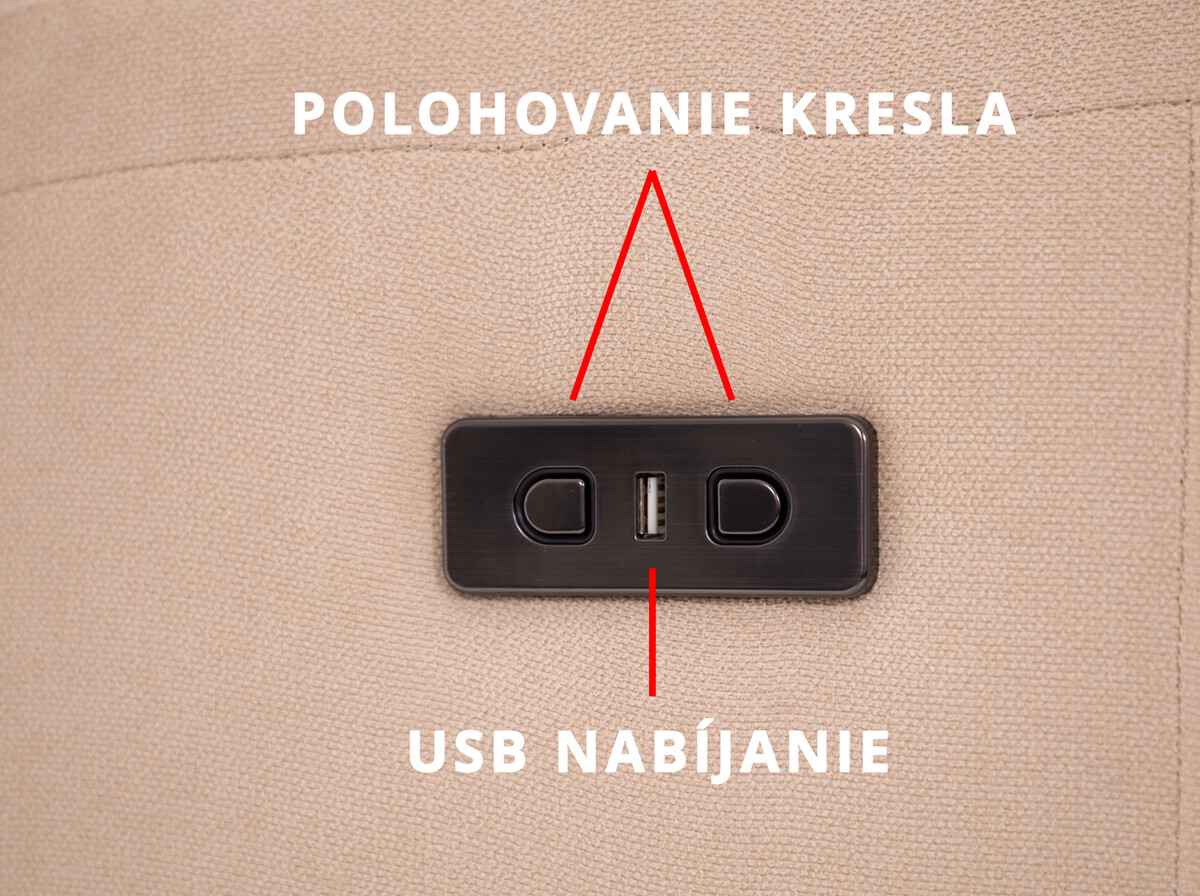 Relaxačné kreslo je doplnené na dnešnú dobu už priam nevyhnutným USB nabíjacím portom. V prípade potreby si tak môžete pohodlne nabiť svoj mobilný telefón, tablet či iné USB nabíjateľné zariadenie.