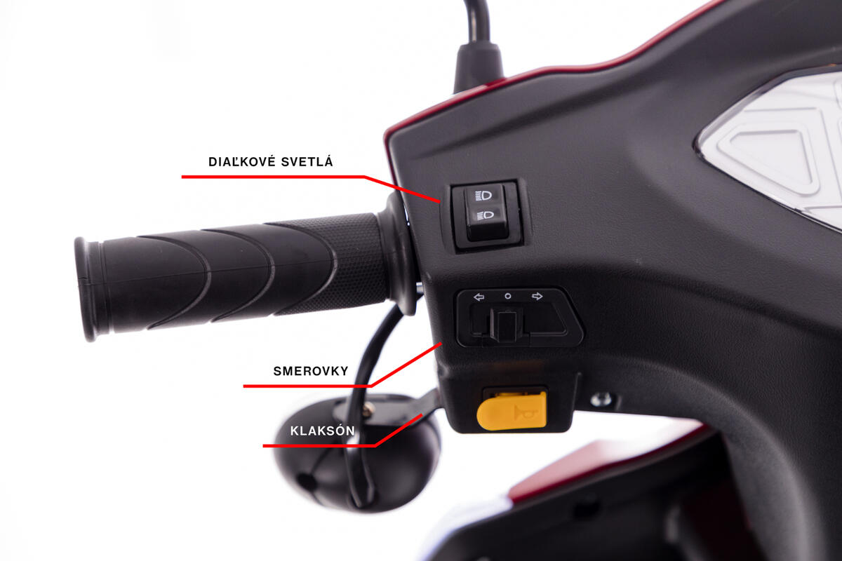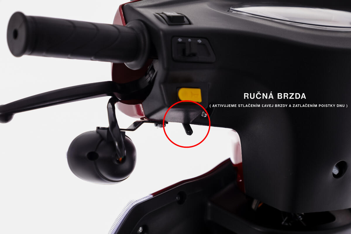 - ručná brzda na riadidlách na úplné zabrzdenie skútra na rovnej ploche