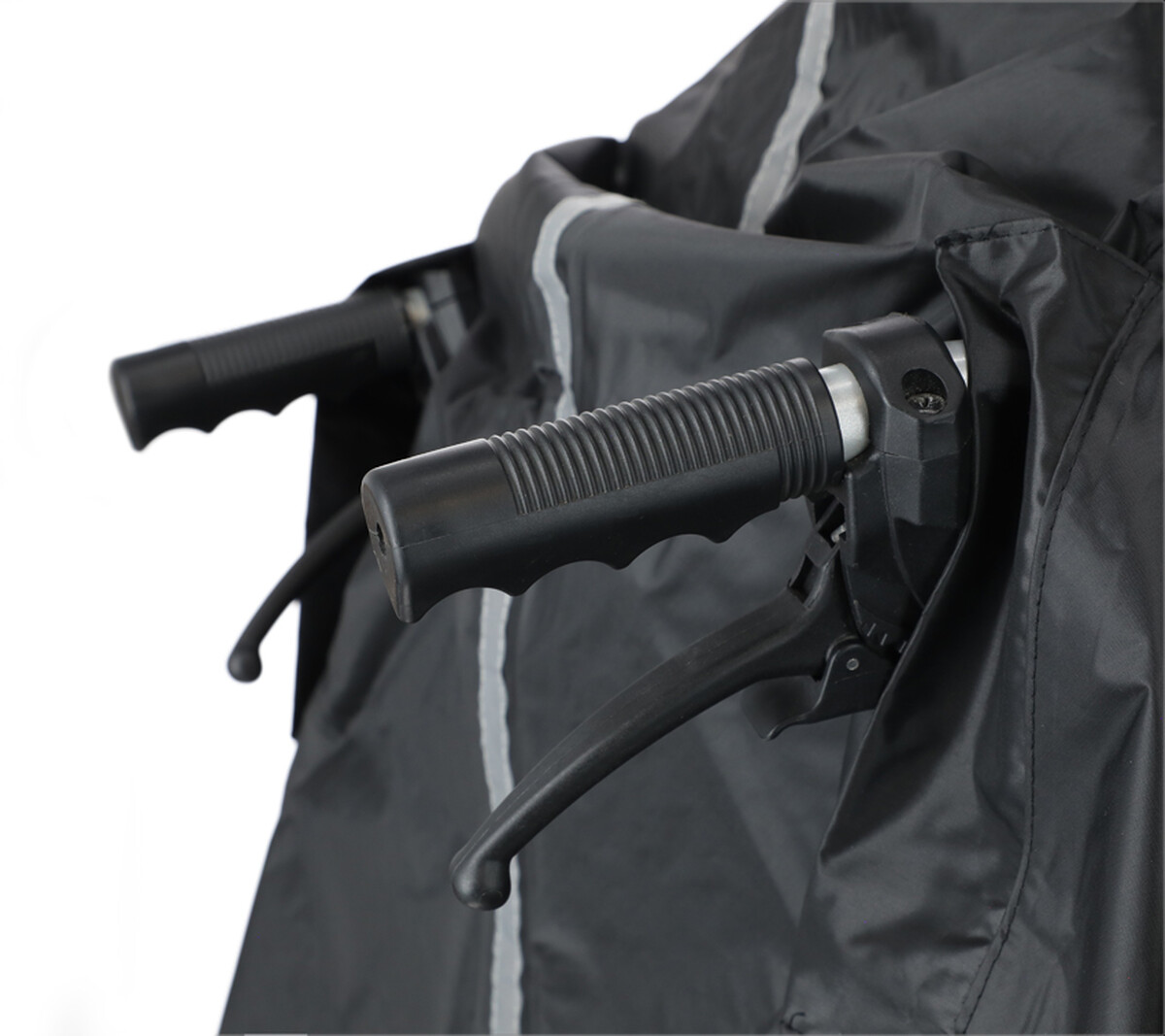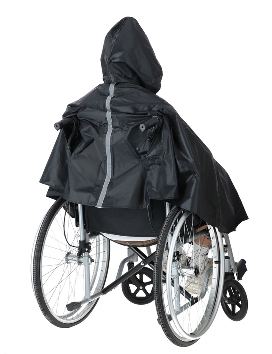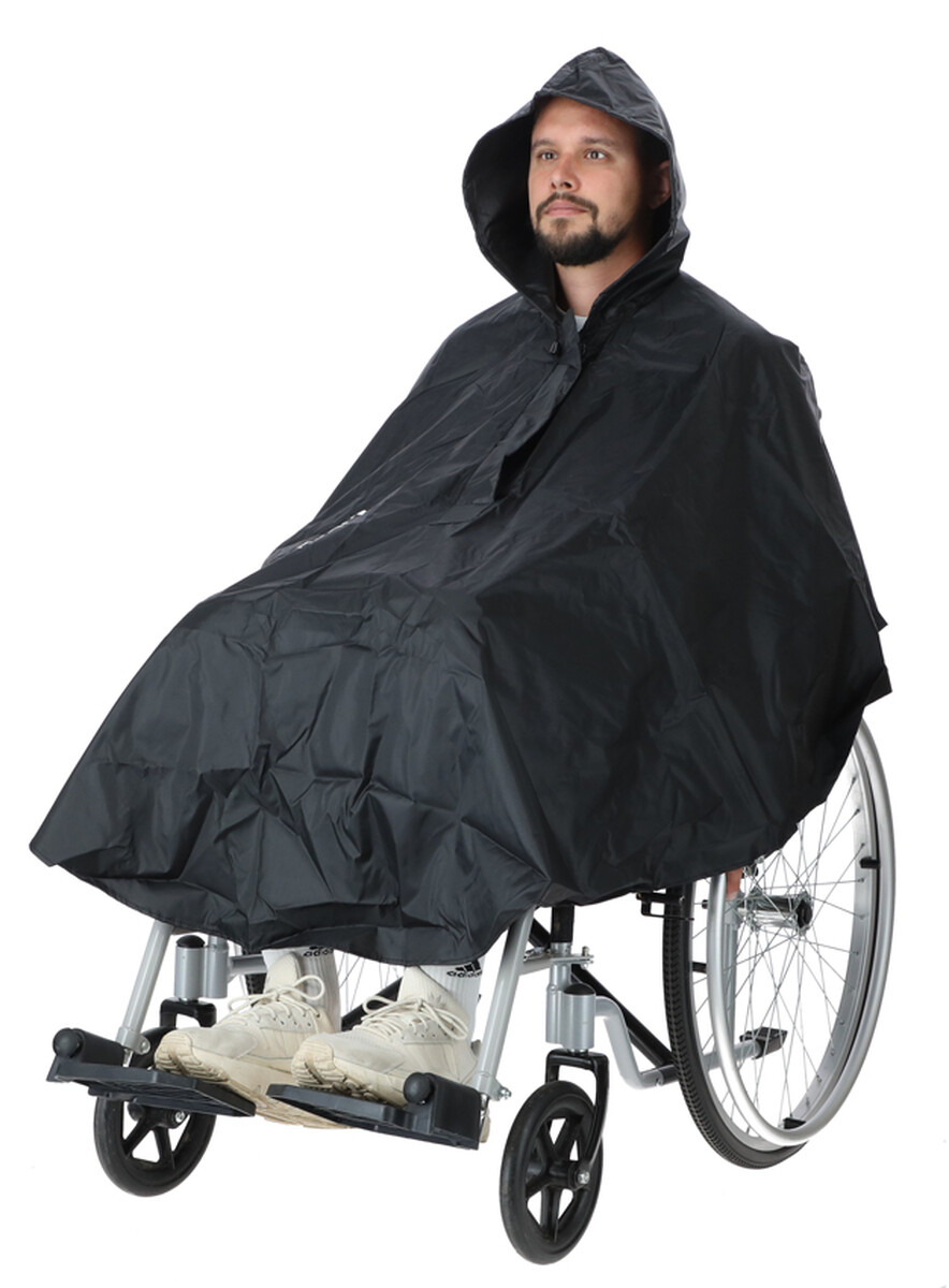 Nepremokavé pončo do dažďa s kapucňou, špeciálne navrhnuté ako užitočný doplnok k invalidným vozíkom.
