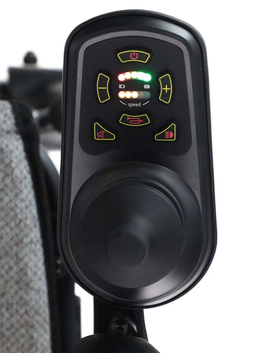 Obsluha elektrického invalidného vozíka je veľmi jednoduchá. Vstavaný ovládací modul – joystick so svetelným indikátorom zvoleného režimu a stavu batérie zaisťuje plynulé a intuitívne ovládanie dopredu, dozadu aj do strán. Na výber je 5 úrovní rýchlostí, pomocou ktorých si používateľ môže prispôsobiť jazdu svojmu zdravotnému stavu a aktuálnym podmienkam v teréne. V prípade potreby je možné zvoliť manuálny režim pre sprievodnú osobu.