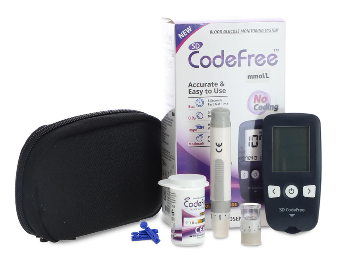 SD CodeFree Plus je moderný a spoľahlivý glukomer navrhnutý na pohodlné a rýchle meranie hladiny cukru v krvi. Vďaka jednoduchej obsluhe je vhodný pre každého používateľa. Meranie prebieha už do 5 sekúnd a vyžaduje len minimálnu kvapku krvi. Nameraný výsledok zobrazený na displeji dopĺňa zvukový signál, takže ihneď viete, či je hladina glukózy nízka, optimálna alebo vysoká.