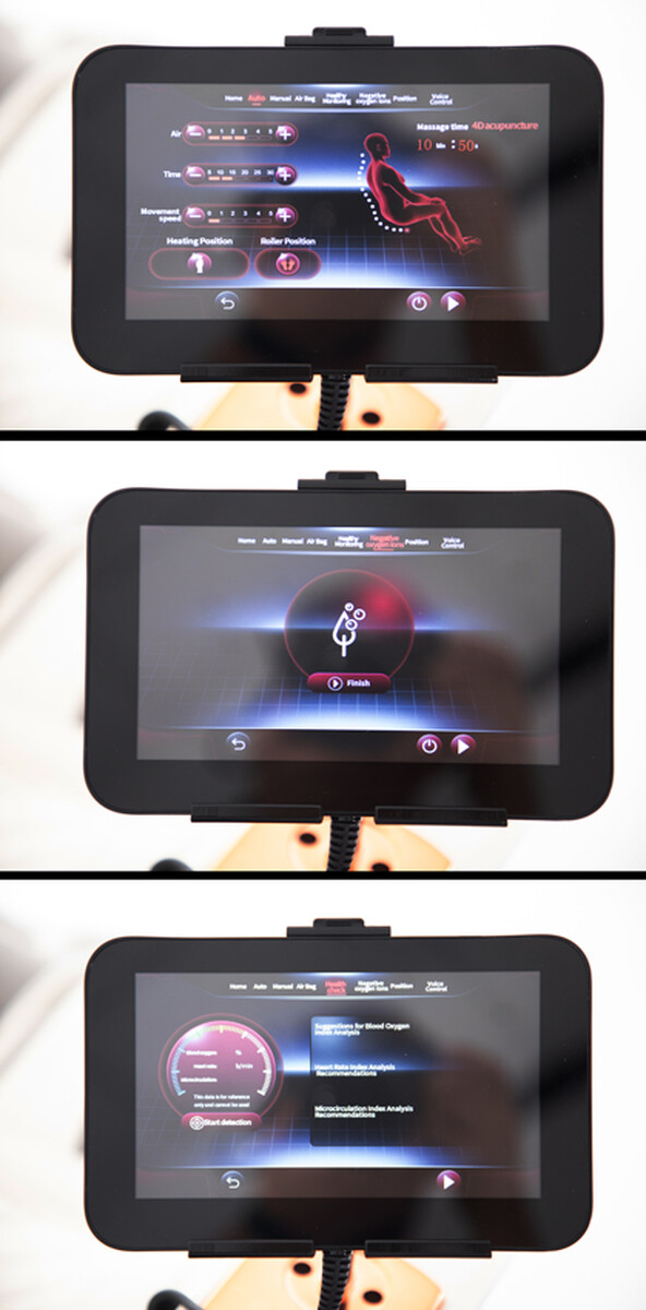 Všetky dostupné funkcie sú poruke v integrovanom ovládaní s používateľsky prívetivým rozhraním. Veľký dotykový LCD displej a otočný regulátor umožňujú plné prispôsobenie masáže. Vďaka pokročilému hlasovému ovládaniu môžete jednoducho zadávať príkazy (v anglickom jazyku) a ovládať tak kreslo ešte pohodlnejšie.