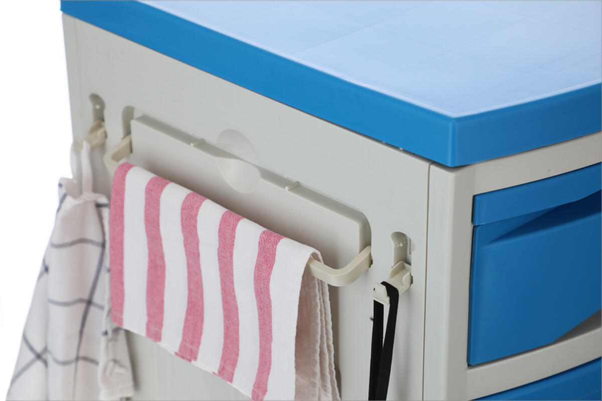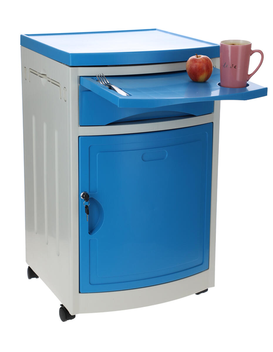 Nemocničný nočný stolík k polohovateľným posteliam ponúka dostatok úložného priestoru. Okrem základnej skrinky a zásuvky je vybavený výsuvnou jedálenskou doskou a praktickými bočnými vešiakmi.