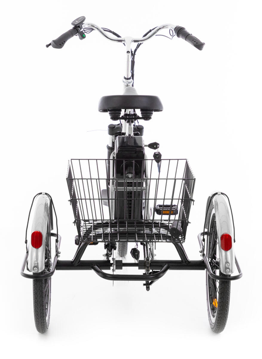 Praktický a ľahko ovládateľný trojkolesový bicykel pre seniorov s prídavným elektrickým pohonom a bohatým úložným priestorom.