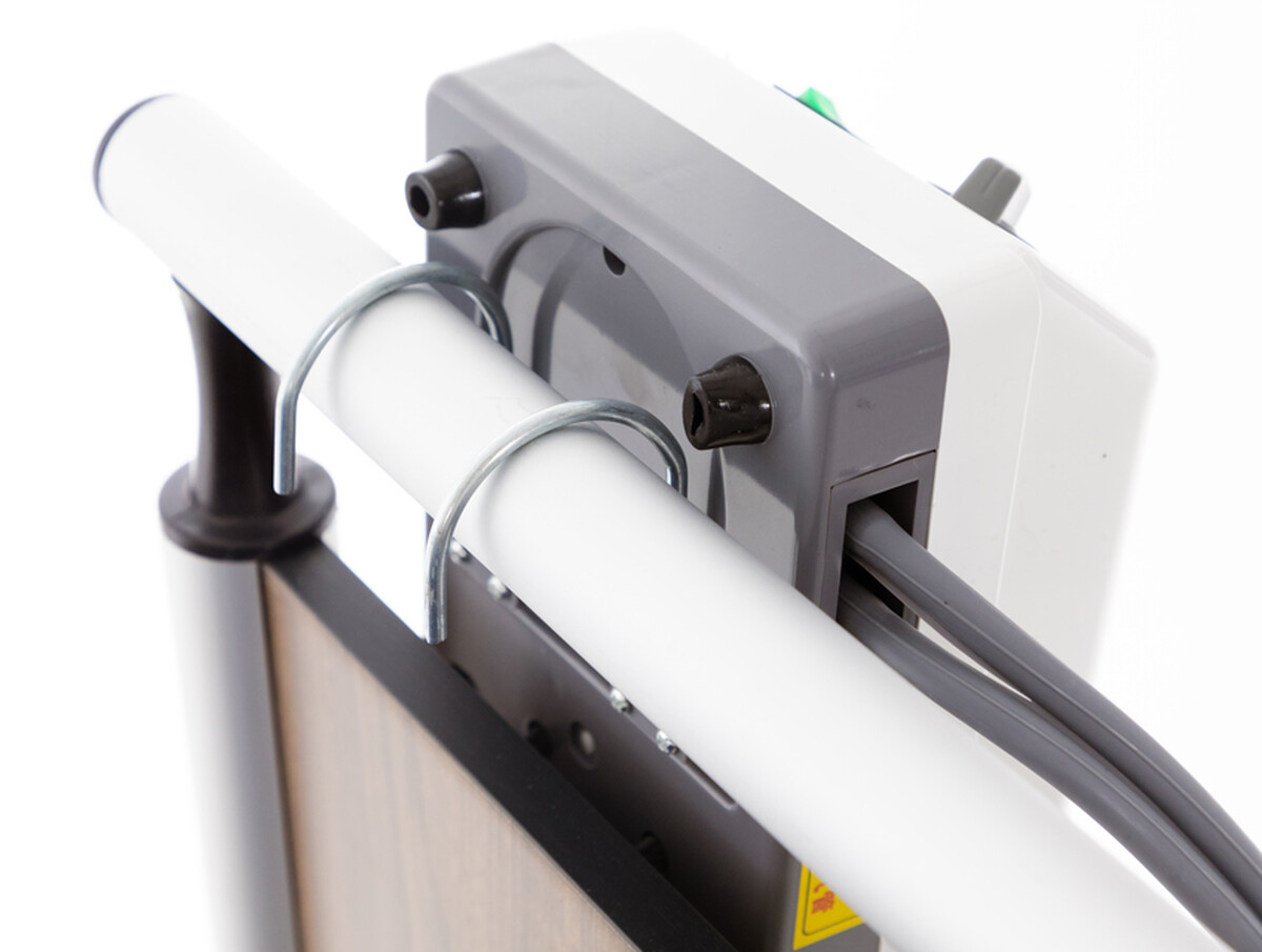 Tlak polohovania sa nastavuje plynulo pomocou otočného regulátora na kompresore, ktorý je vybavený háčikmi na bezpečné upevnenie k posteli.