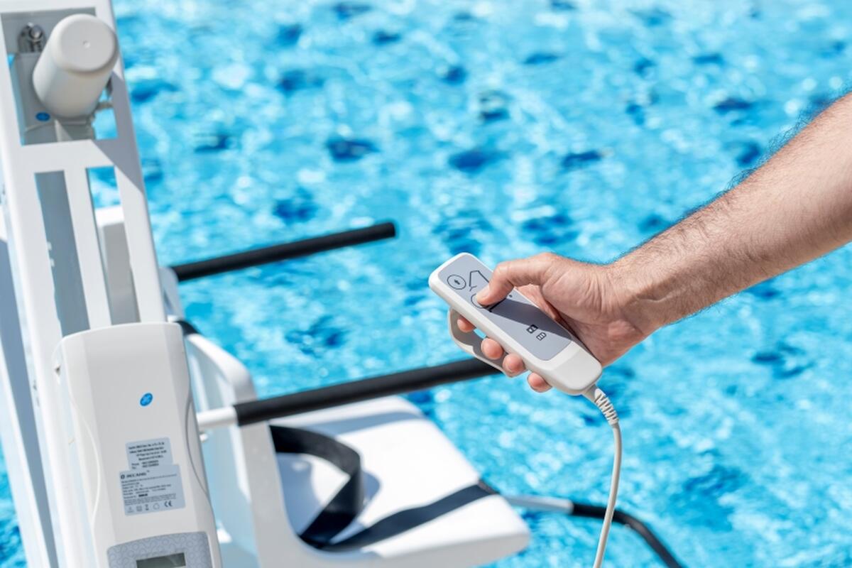 Intuitívne ovládanie bazénového zdviháka umožňuje vodotesný káblový ovládač s jasne označenými tlačidlami. Pohyb zdviháka je plynulý, presný a bez trhavých prechodov, čo poskytuje používateľovi aj asistentovi istotu počas celého procesu spúšťania a zdvíhania.
