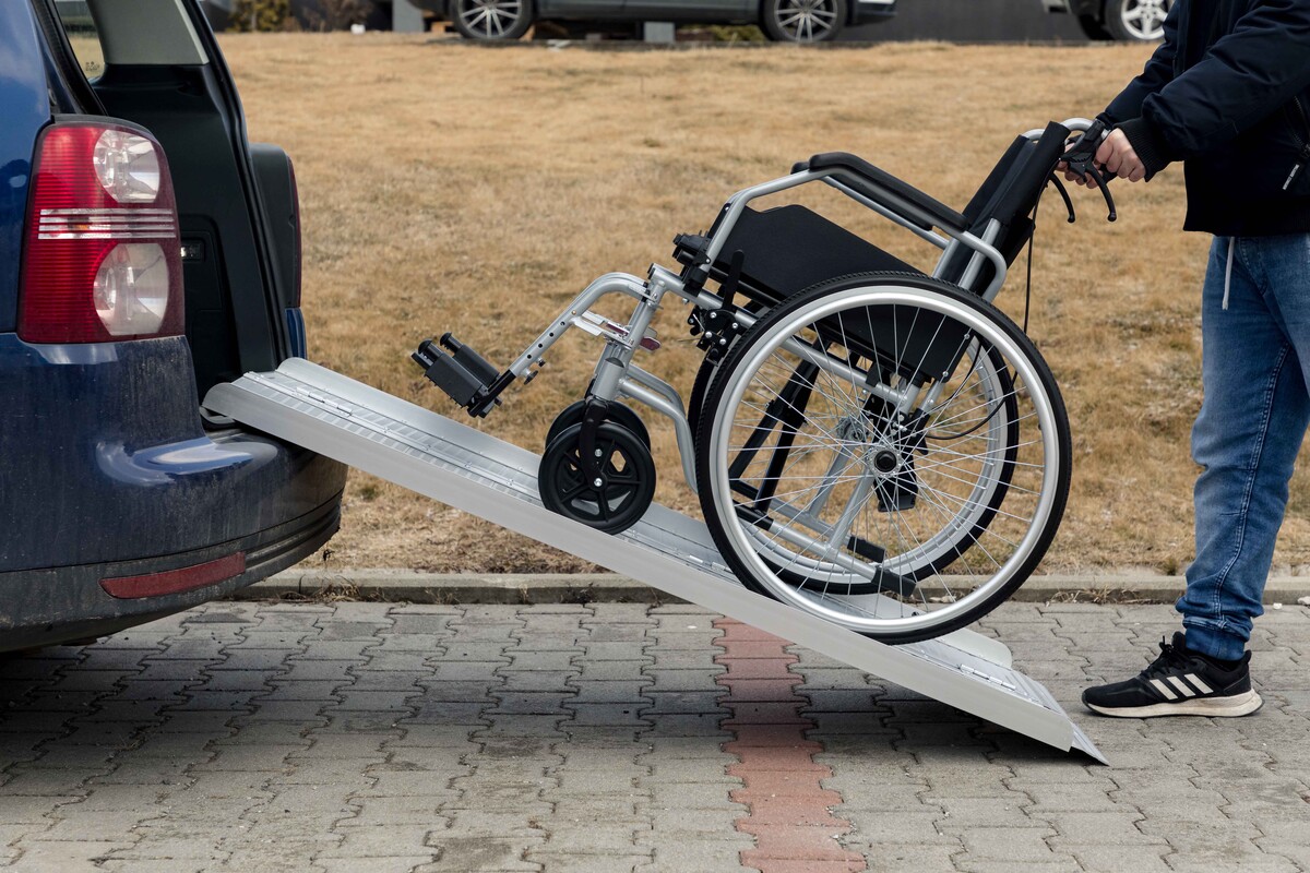 Prenosná nájazdová rampa pomáha pri prekonaní bariér, vhodná na nakladanie a vykladanie invalidných vozíkov a iných prostriedkov.
