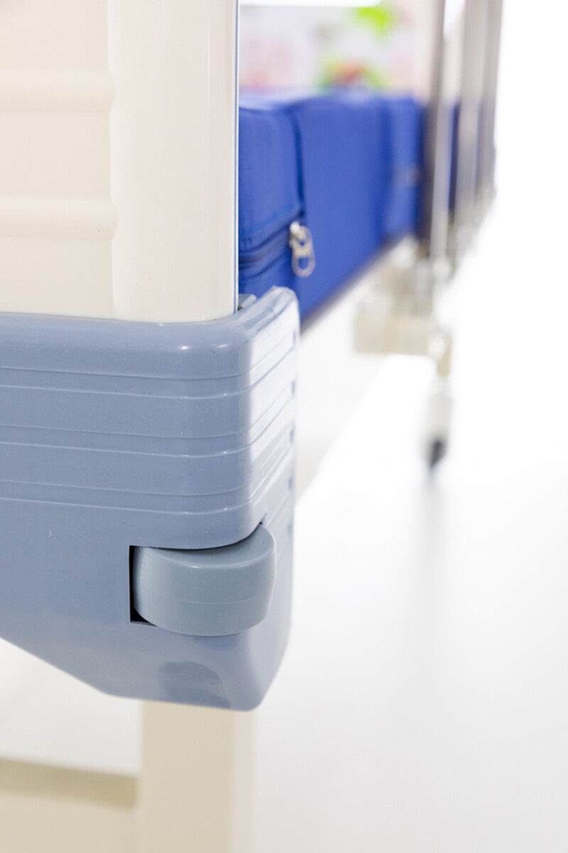 Súčasťou výbavy detskej nemocničnej postele sú odnímateľné plastové čelá a 40 cm vysoké sklopné bočnice z nehrdzavejúcej ocele s plastovými krytmi, ktoré chránia dieťa pred pádom a ošetrovateľom uľahčujú prístup k lôžku.