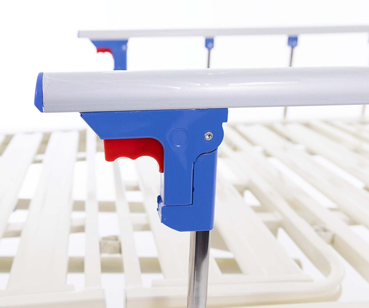 Bočnice s výškou 40 cm sa dajú ľahko sklopiť, vďaka čomu zjednodušujú ošetrovateľom prístup k pacientom. K dispozícii je takisto hrazda s trianglom a nastaviteľným popruhom.