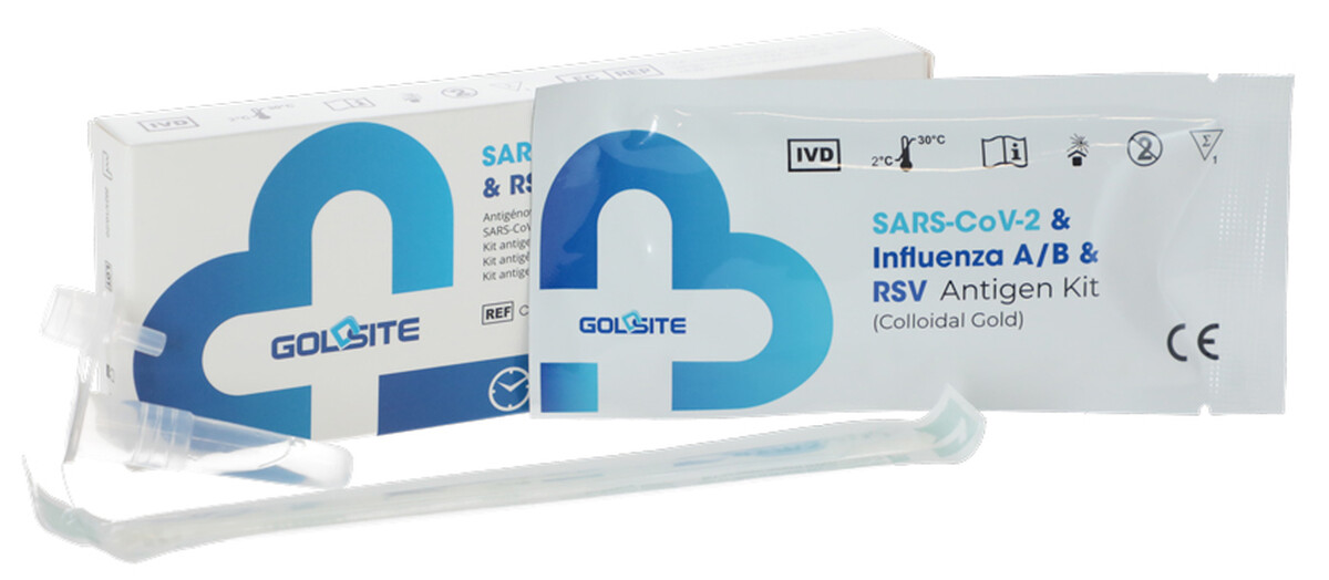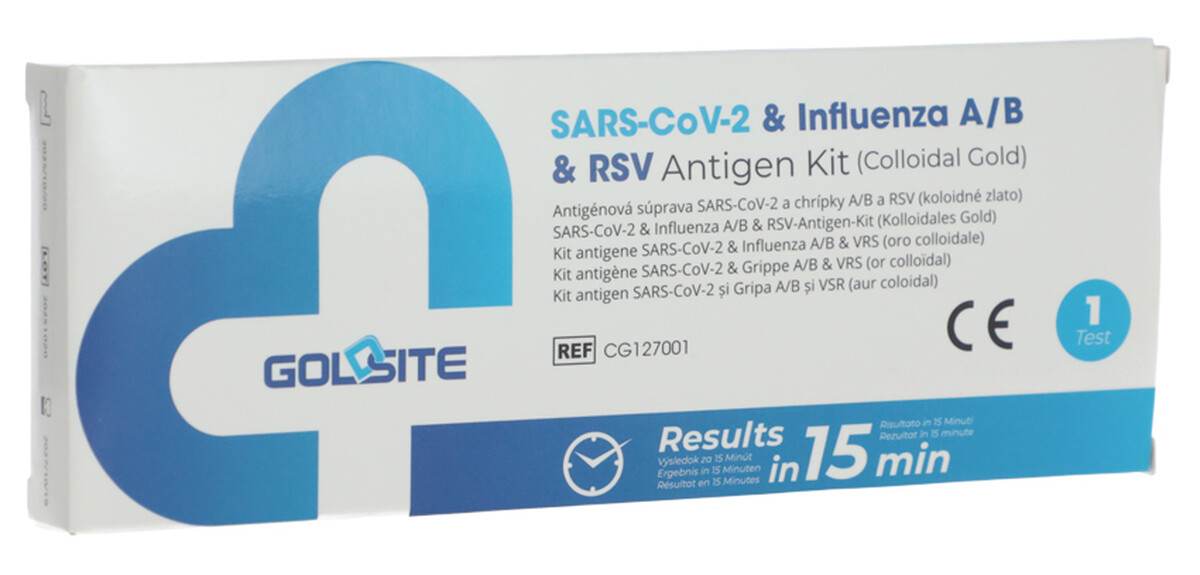 Kombinovaný antigénový rýchlotest na kvalitatívnu detekciu SARS-CoV-2, chrípky A, B a respiračného syncytiálneho vírusu (RSV) vo výtere z nosovej dutiny.