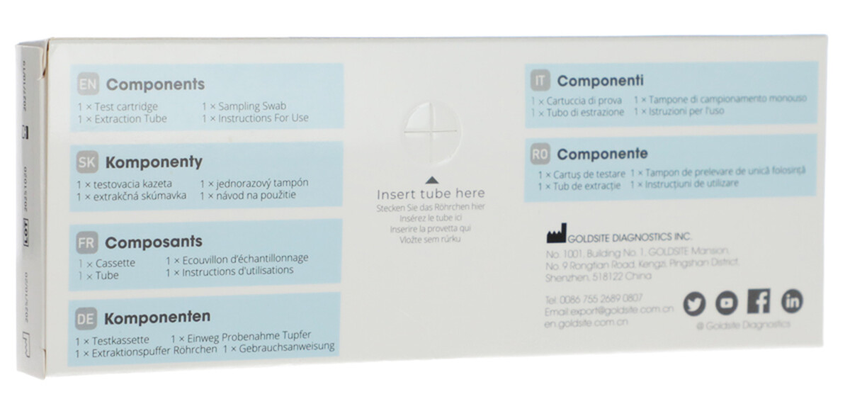1 ks IN VITRO, na profesionálne použitie. Rýchly, neinvazívny kombinovaný antigénový výterový test na kvalitatívnu detekciu nucleocapsidového proteínu, antigénu SARS-CoV-2, prostredníctvom vzorky z nosového výteru už od 2cm