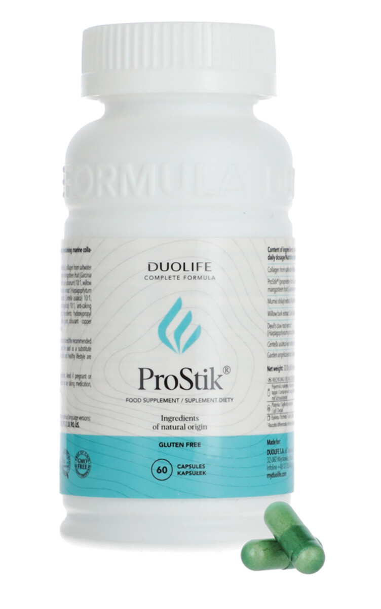 DUOLIFE ProStik je výživový doplnok navrhnutý na podporu zdravia kĺbov a kostí. Vďaka kombinácii kolagénu a starostlivo vybraných rastlinných extraktov pomáha udržiavať pružnosť kĺbov, podporuje regeneráciu tkanív a prispieva k celkovej fyzickej pohode. Okrem toho tiež pomáha podporovať hojenie rán, duševnú pohodu a tiež fyziologickú obranyschopnosť organizmu pred nepriaznivými podmienkami prostredia.
