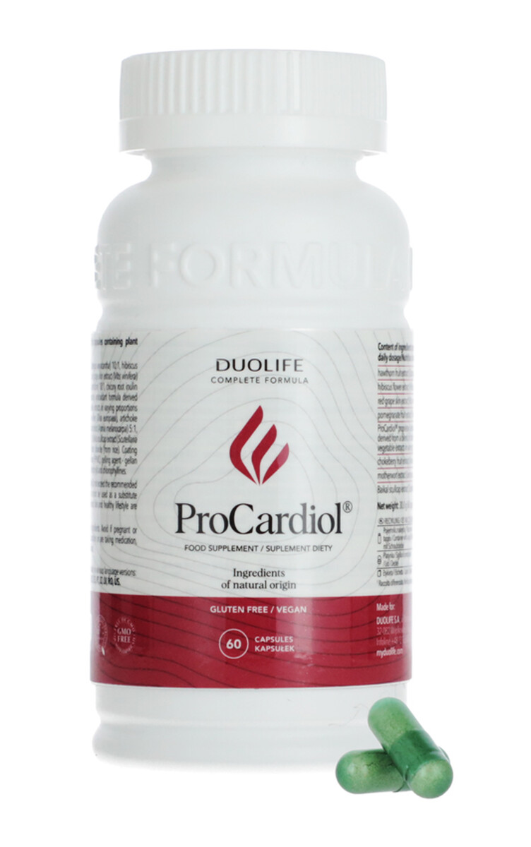 DUOLIFE ProCardiol je komplexný výživový doplnok navrhnutý na podporu srdcového svalu a ochranu cievneho systému. Vďaka unikátnemu spojeniu prírodných extraktov napomáha udržiavať optimálny krvný tlak, podporuje prirodzenú pružnosť ciev a prispieva k efektívnemu prekrveniu mikrociev. ProCardiol pôsobí ako silný štít proti oxidačnému stresu, čím chráni bunky kardiovaskulárneho aparátu a posilňuje celkovú kondíciu organizmu.