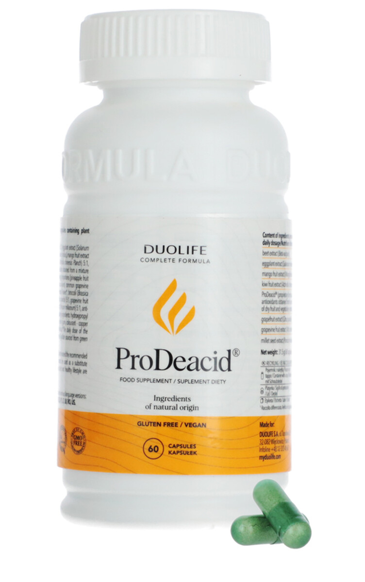 DUOLIFE ProDeacid je komplexný výživový doplnok navrhnutý na podporu metabolizmu a detoxikačných procesov organizmu. Vďaka unikátnemu spojeniu rastlinných extraktov napomáha udržiavať optimálnu acidobázickú rovnováhu (pH), podporuje regeneráciu buniek a prispieva k efektívnej látkovej premene. ProDeacid pôsobí ako prirodzený štít, ktorý chráni bunky pred oxidačným stresom a posilňuje celkovú vitalitu organizmu v dnešnom náročnom prostredí.