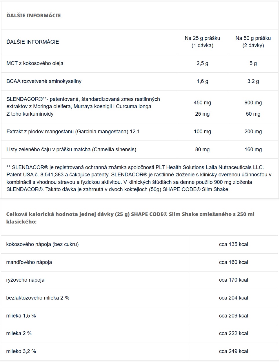 • patentovaná zmes SLENDACOR® – synergické zloženie podporujúce chudnutie, je založené na troch rastlinných extraktoch: z podzemku kurkumy, z listov kari a z listov moringy olejnej
