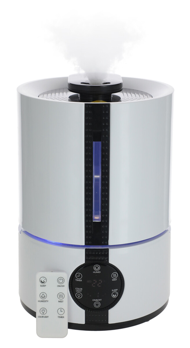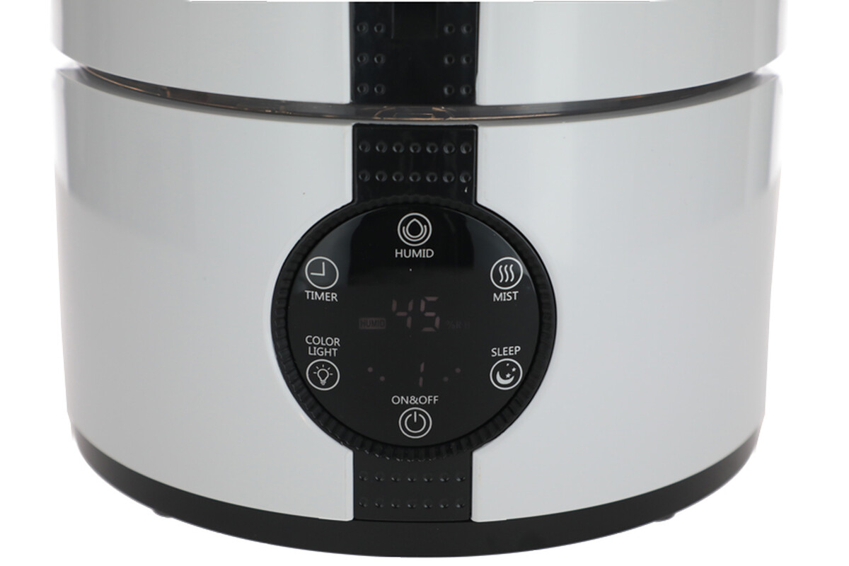 Ultrazvukový difuzér studenej hmly HQ-JS836 ponúka intuitívne ovládanie cez dotykový panel alebo pribalený diaľkový ovládač (napájaný batériou CR2025, ktorá je súčasťou balenia). Nastaviť je možné cieľovú vlhkosť vzduchu v rozsahu od 45 % až po 95 %, intenzitu hmly v 3 stupňoch a tiež časovač v rozmedzí 1, 2, 4 alebo 8 hodín. Pre dotvorenie atmosféry si môžete zvoliť modré podsvietenie nádrže, ktoré je možné kedykoľvek deaktivovať. Vypnúť je možné aj podsvietenie displeja, ktoré vás v kombinácii s mimoriadne tichou prevádzkou nebude rušiť ani počas spánku.