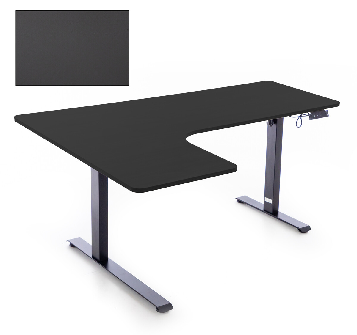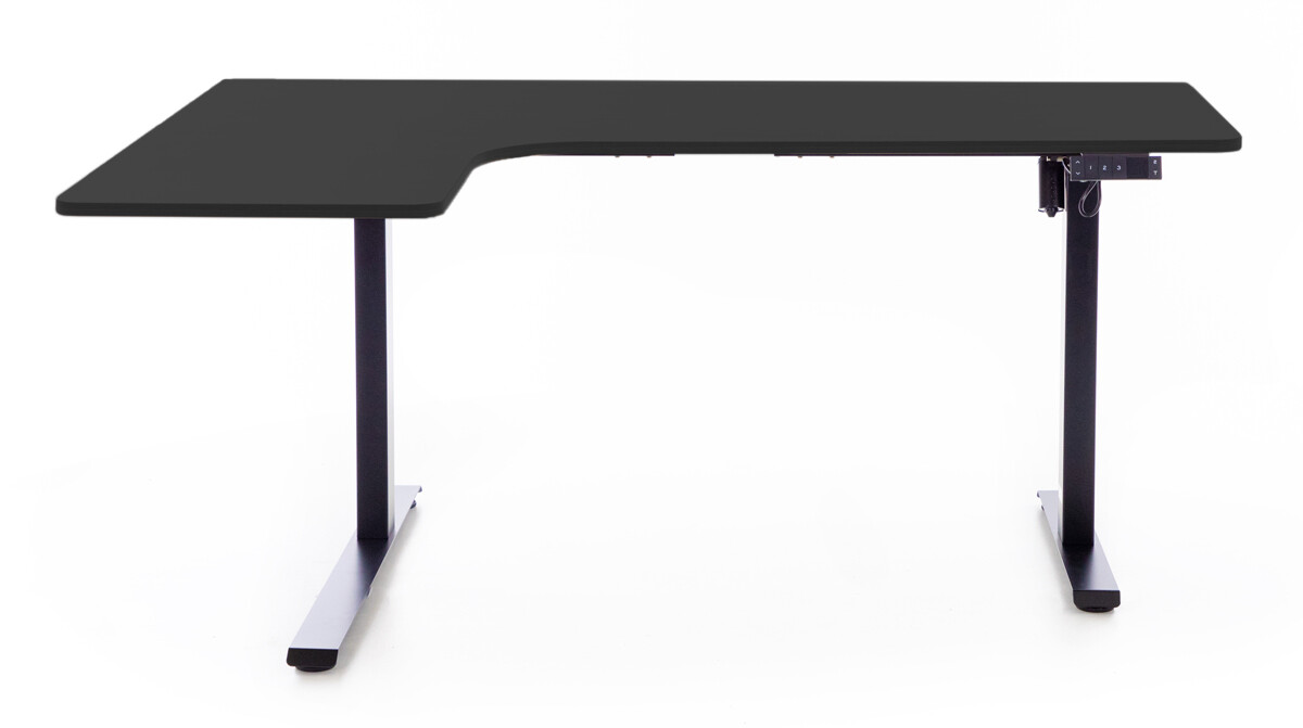 Elektrický výškovo nastaviteľný stôl (ľavý roh) na striedavú prácu v sede a stoji. Pamäť 3 výškových pozícií a časovač pre lepší komfort aj produktivitu.